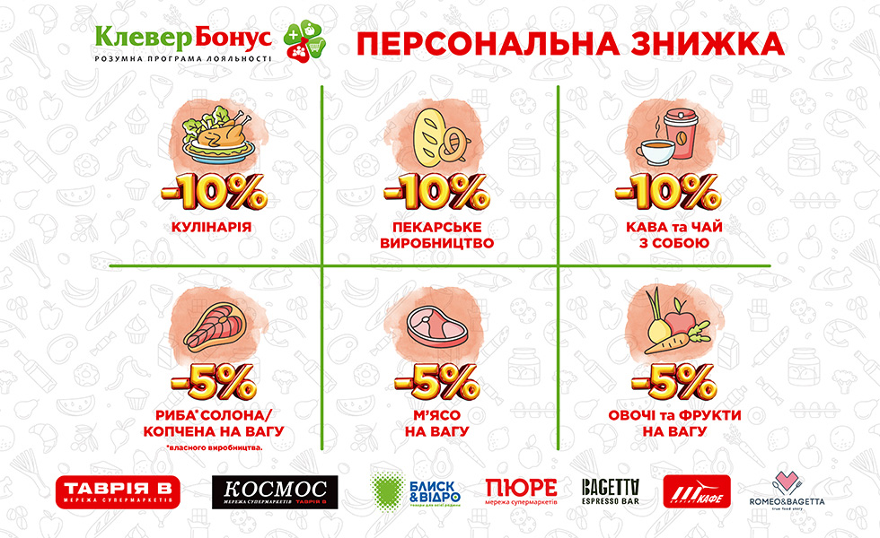 10% – Хліб та випічка власного виробництва, Кулінарія, Кава та чай з собою.