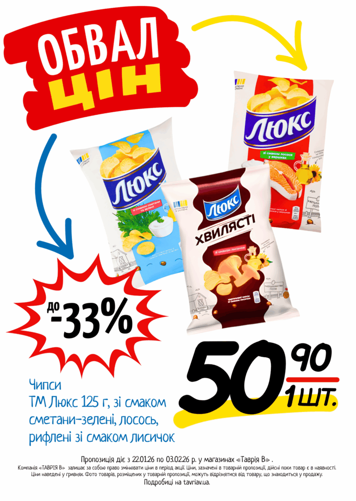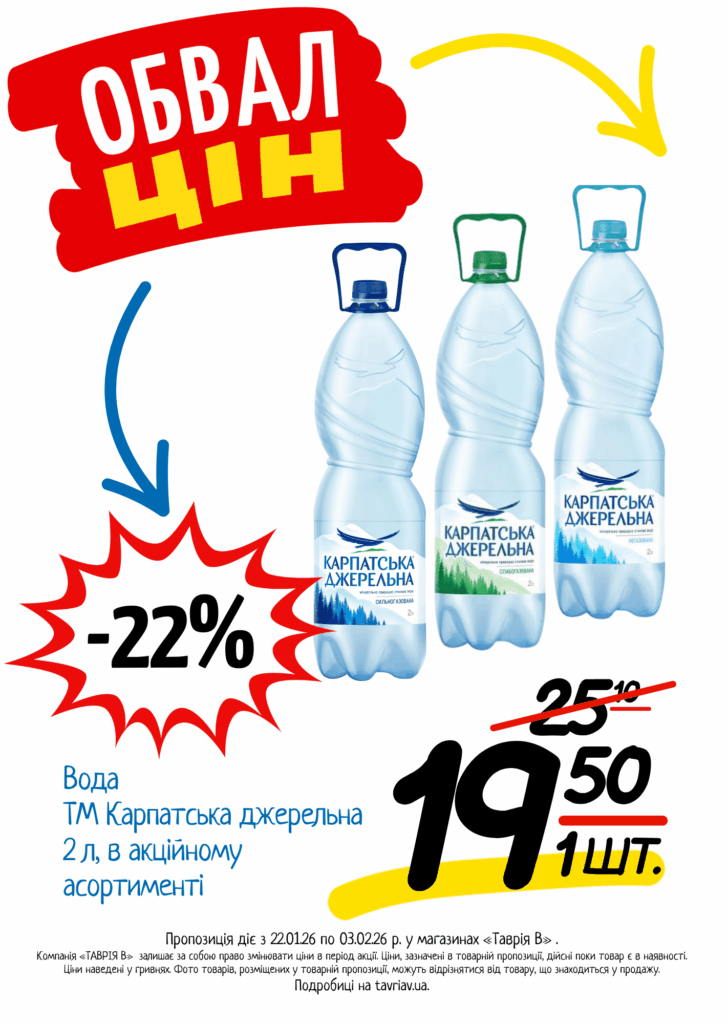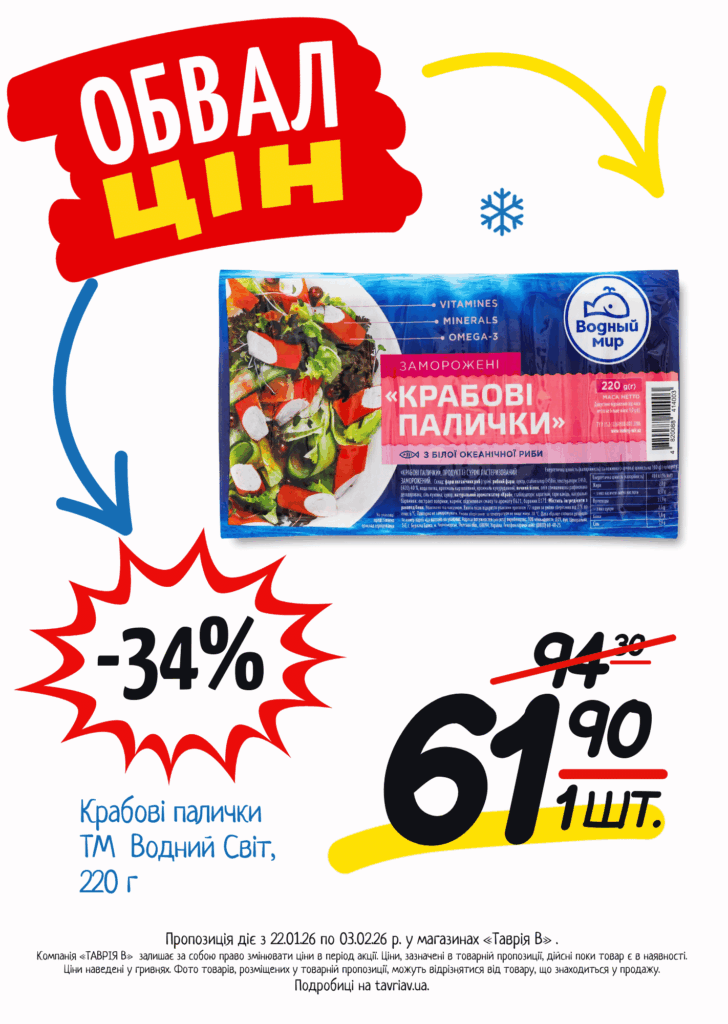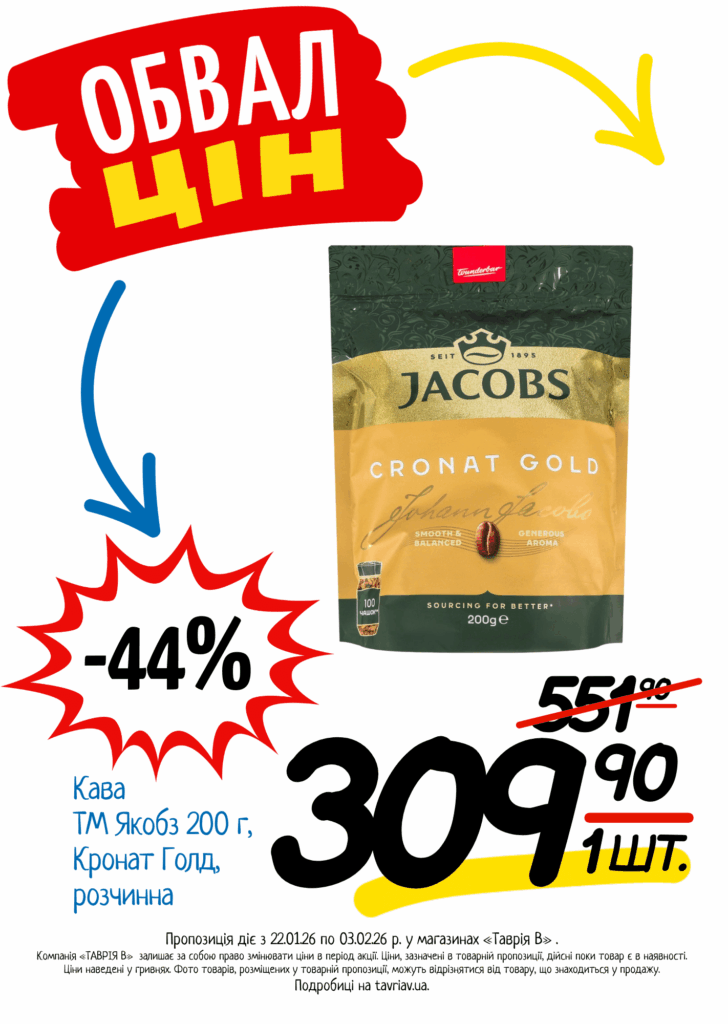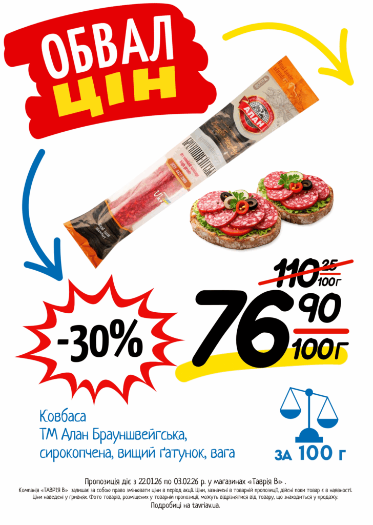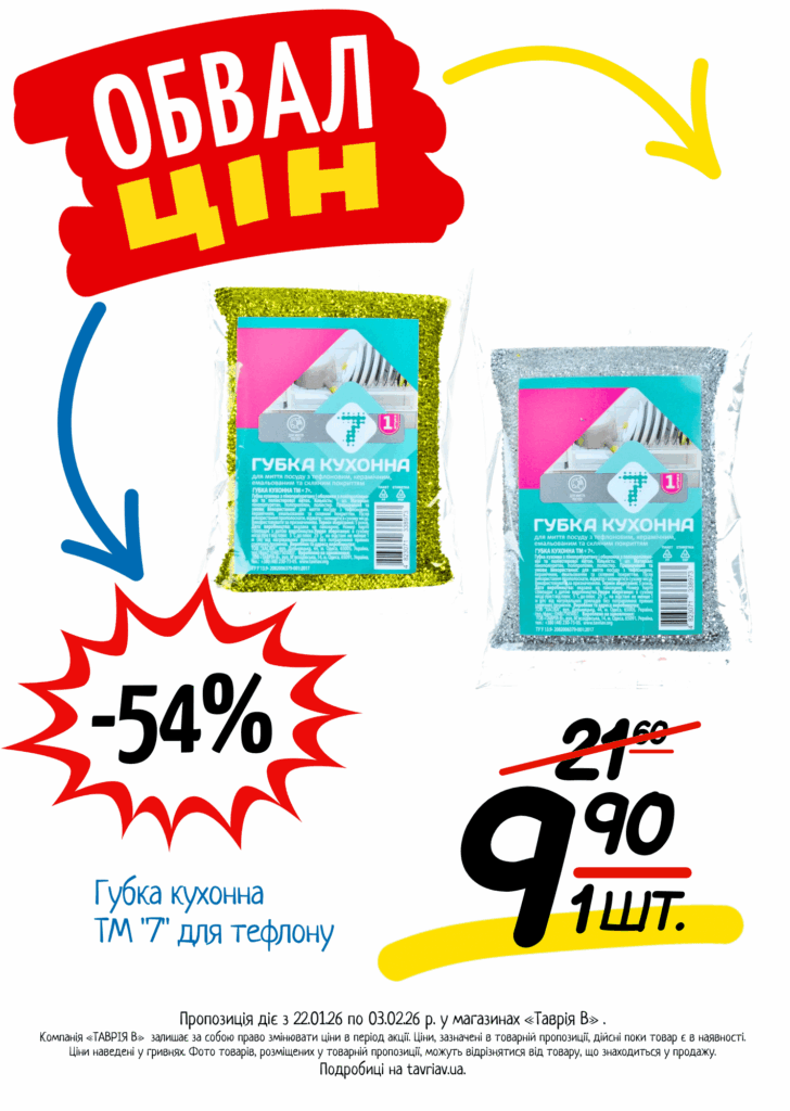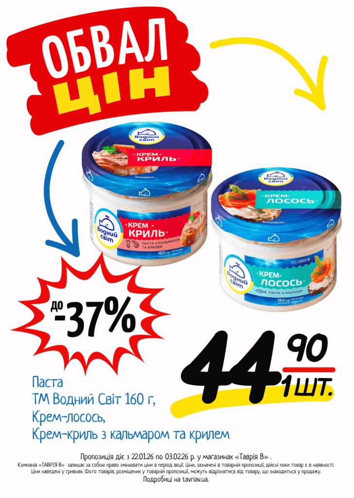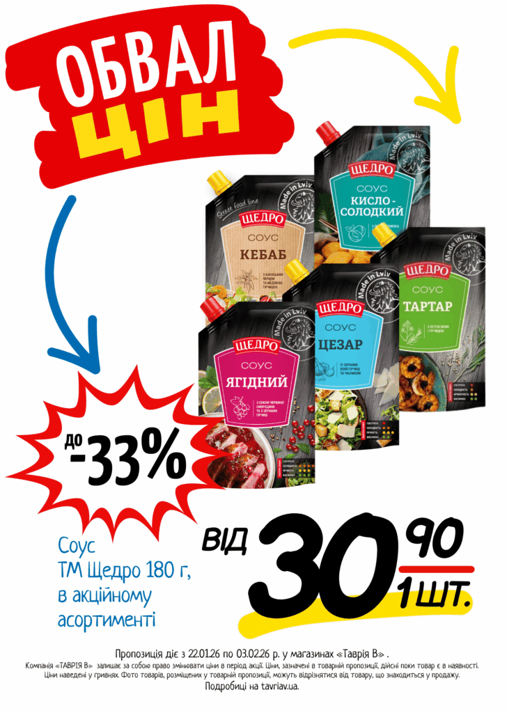 З 22.01 по 03.02.2026 р. в супермаркетах «ТАВРІЯ В» діє акція «Обвал Цін». Ви можете заощаджувати на купівлі продуктів, дитячого харчування, засобів побутової хімії та догляду за собою.