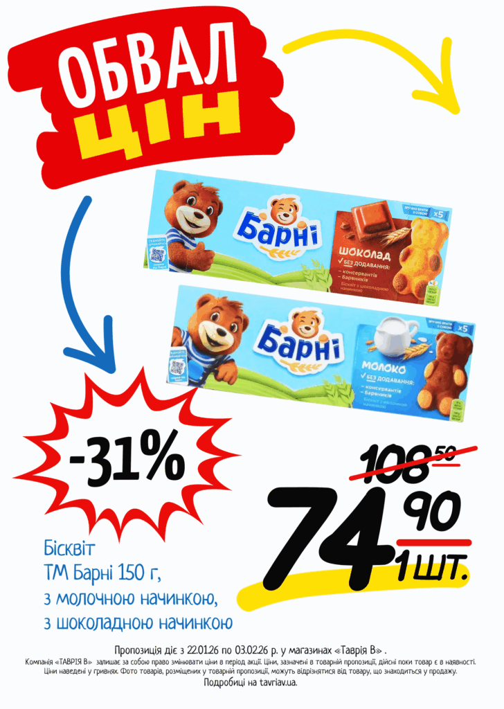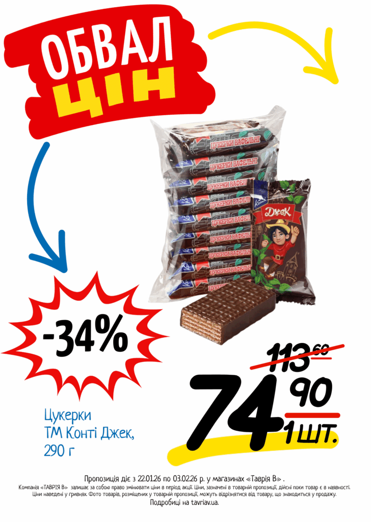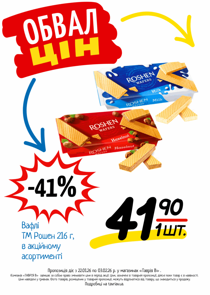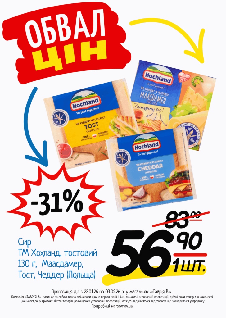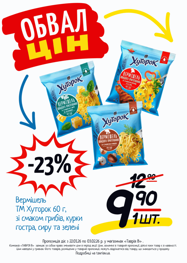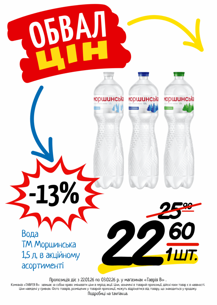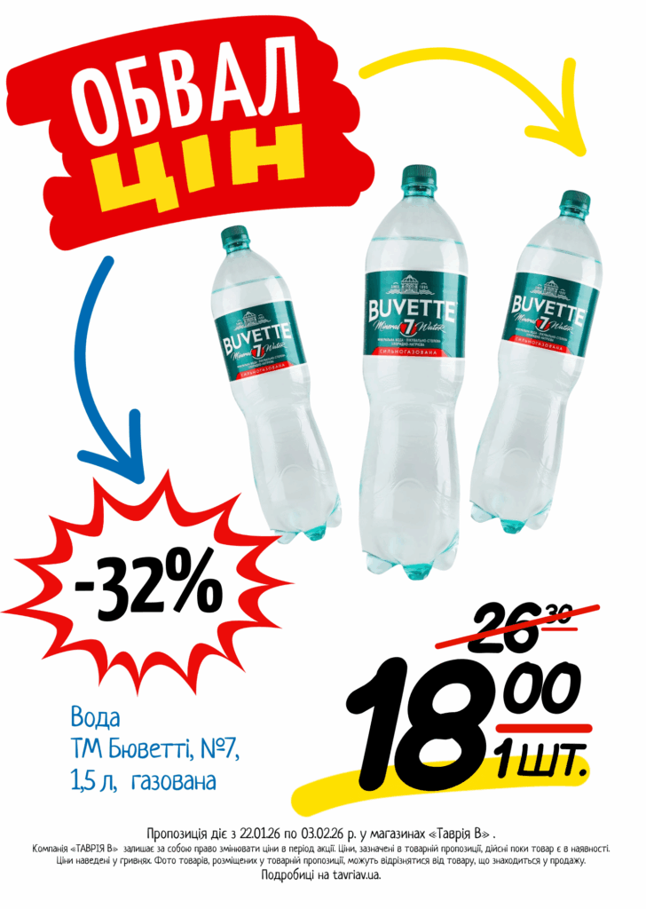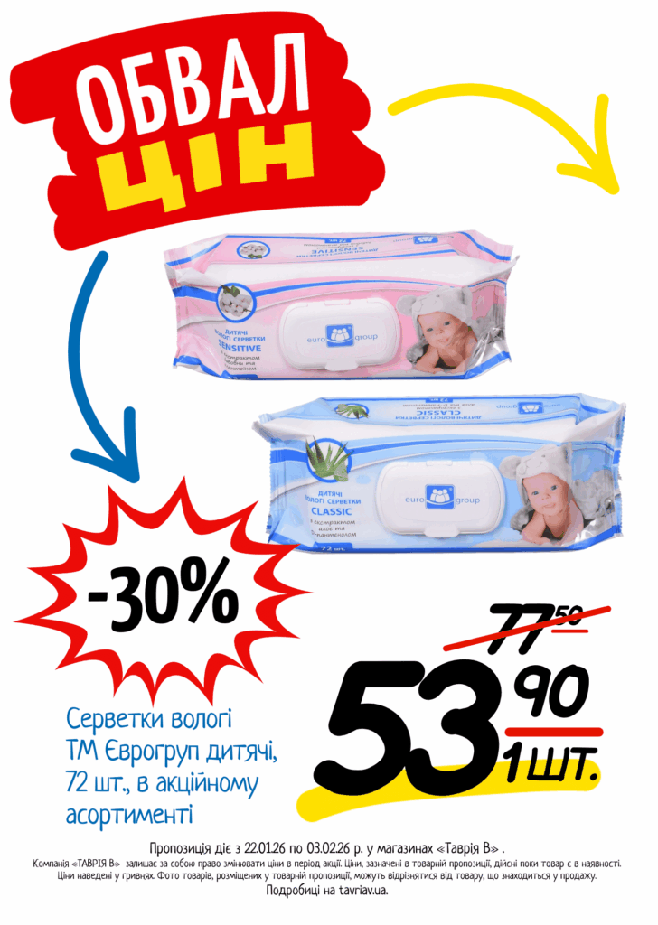 З 22.01 по 03.02.2026 р. в супермаркетах «ТАВРІЯ В» діє акція «Обвал Цін». Ви можете заощаджувати на купівлі продуктів, дитячого харчування, засобів побутової хімії та догляду за собою.