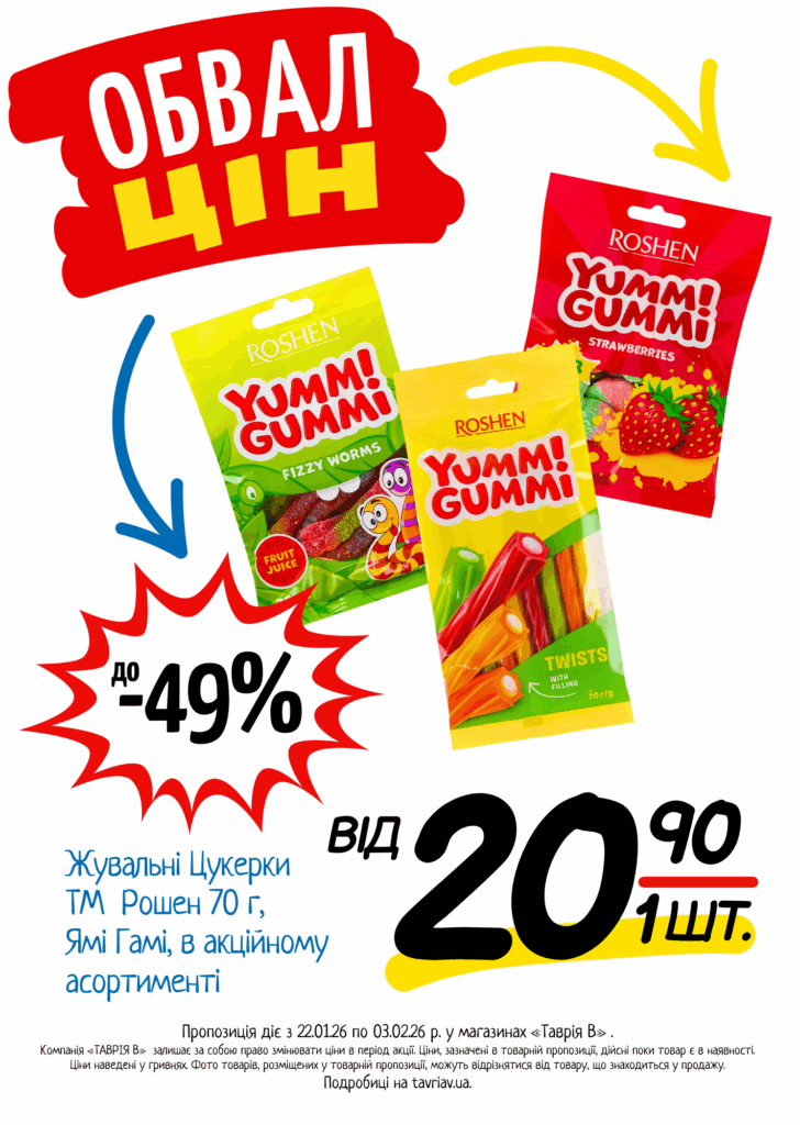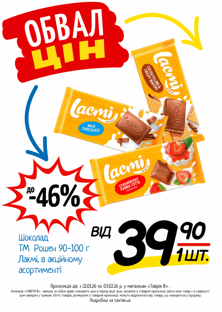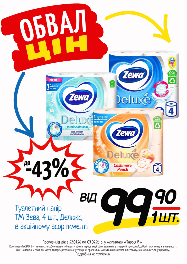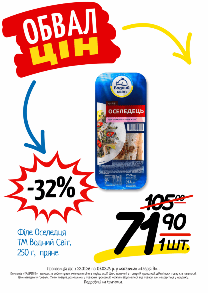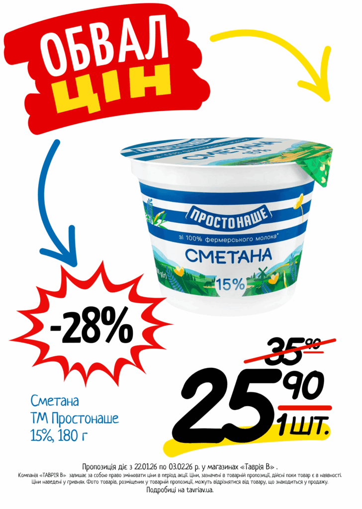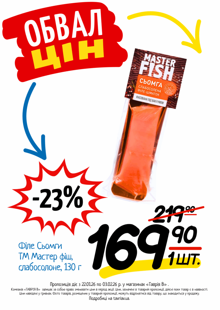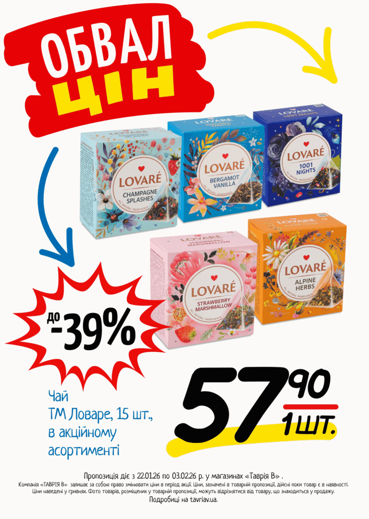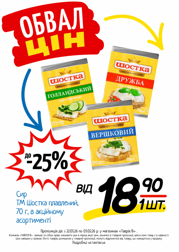 З 22.01 по 03.02.2026 р. в супермаркетах «ТАВРІЯ В» діє акція «Обвал Цін». Ви можете заощаджувати на купівлі продуктів, дитячого харчування, засобів побутової хімії та догляду за собою.