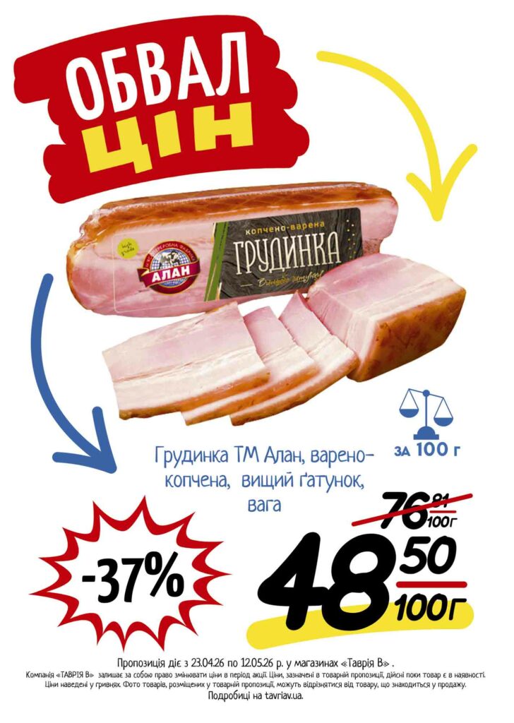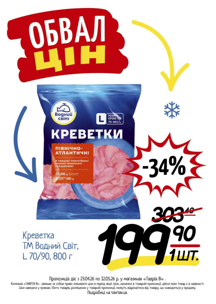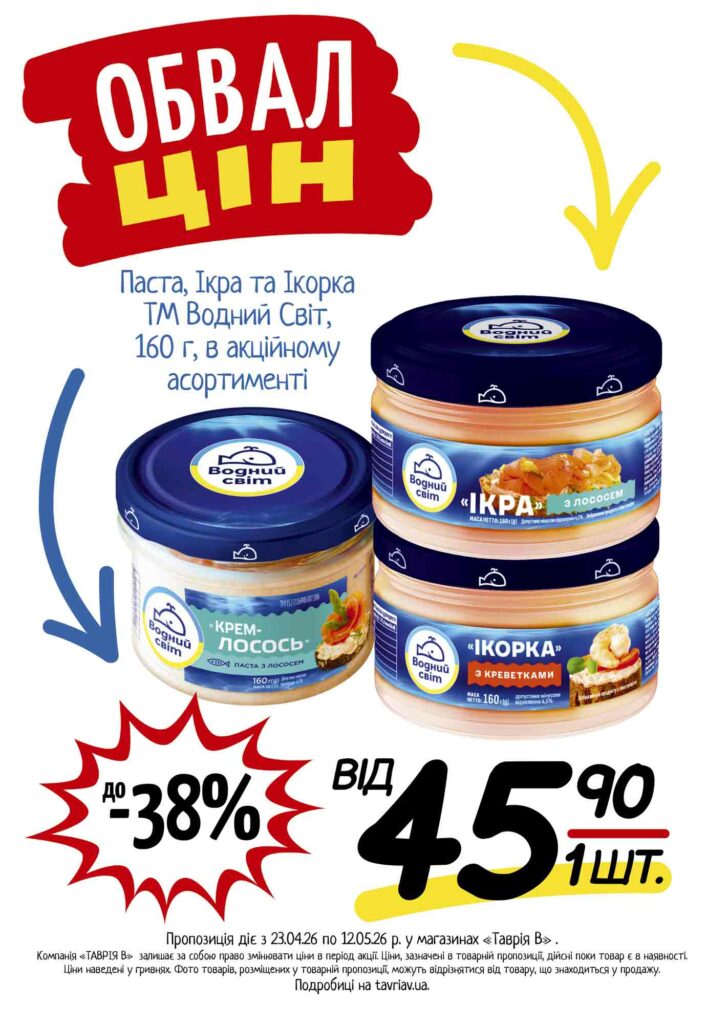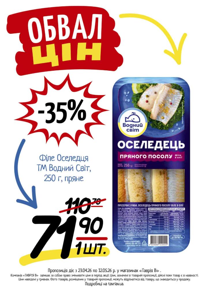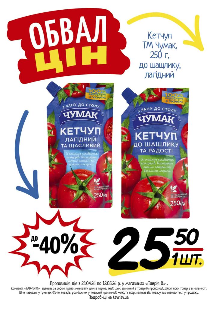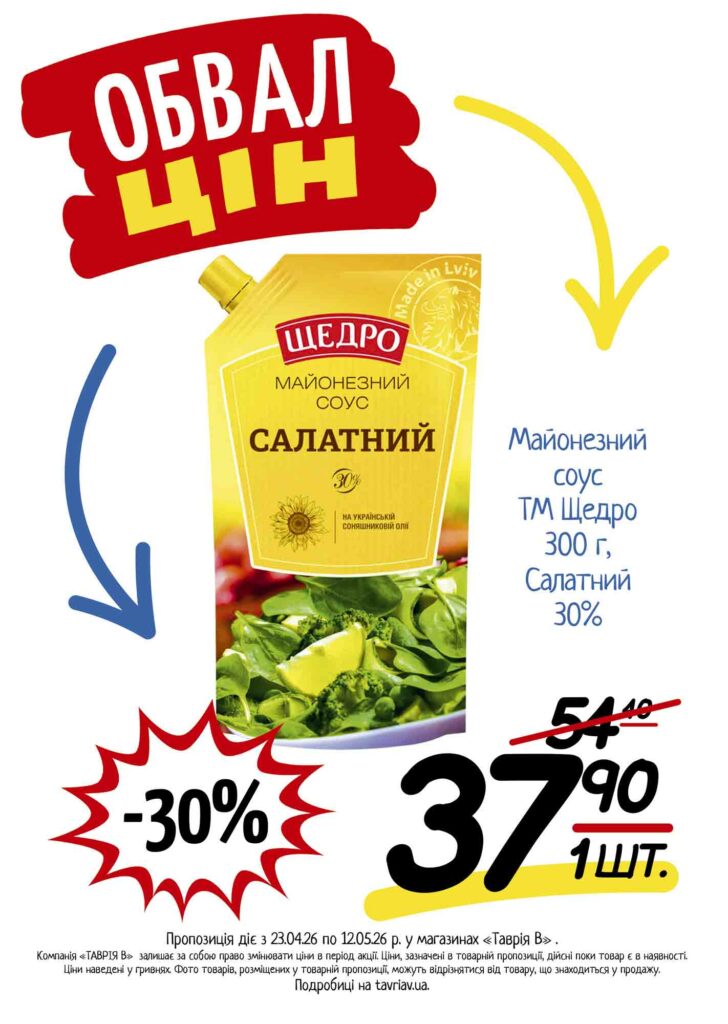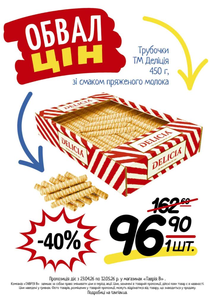 З 23.04 по 12.05.2026 р. в супермаркетах «ТАВРІЯ В» діє акція «Обвал Цін». Ви можете заощаджувати на купівлі продуктів, дитячого харчування, засобів побутової хімії та догляду за собою.