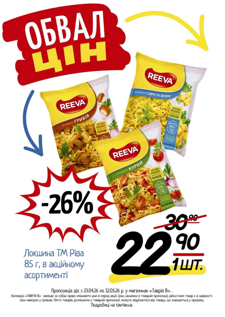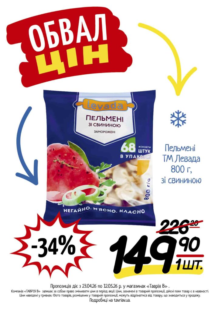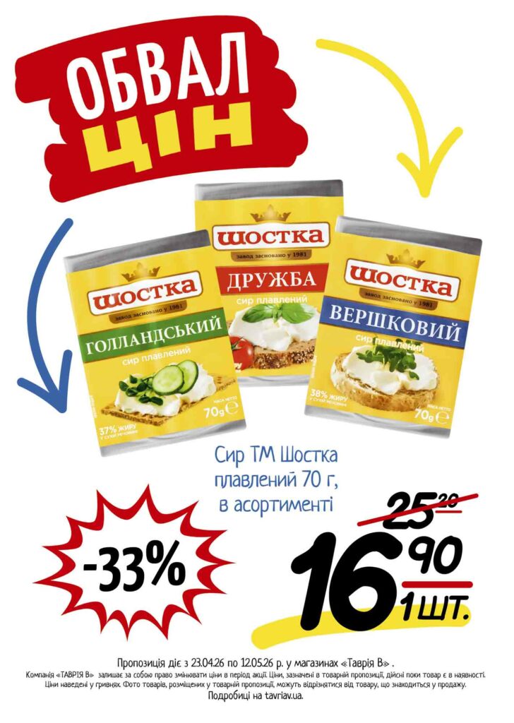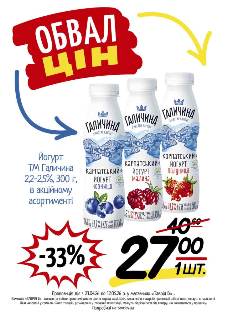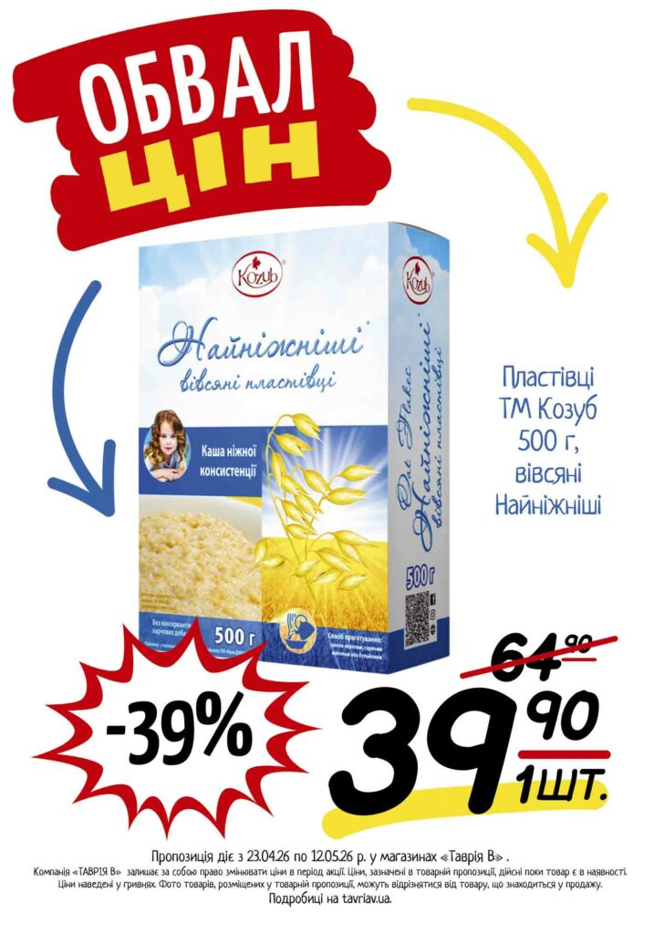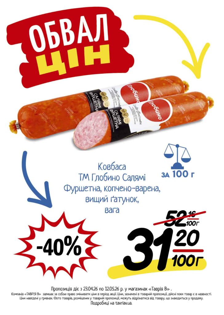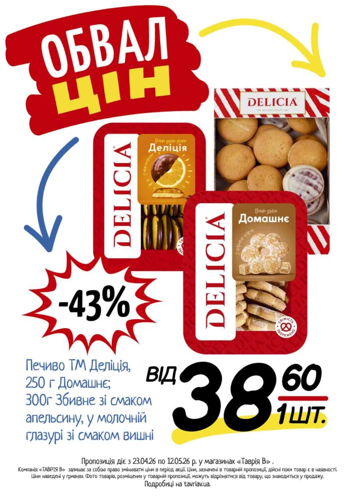 З 23.04 по 12.05.2026 р. в супермаркетах «ТАВРІЯ В» діє акція «Обвал Цін». Ви можете заощаджувати на купівлі продуктів, дитячого харчування, засобів побутової хімії та догляду за собою.