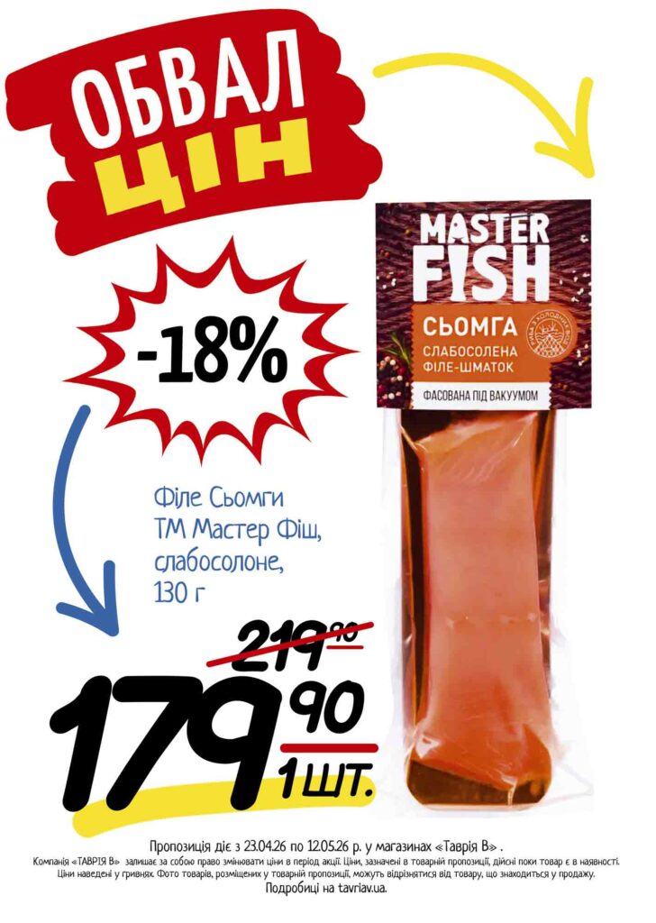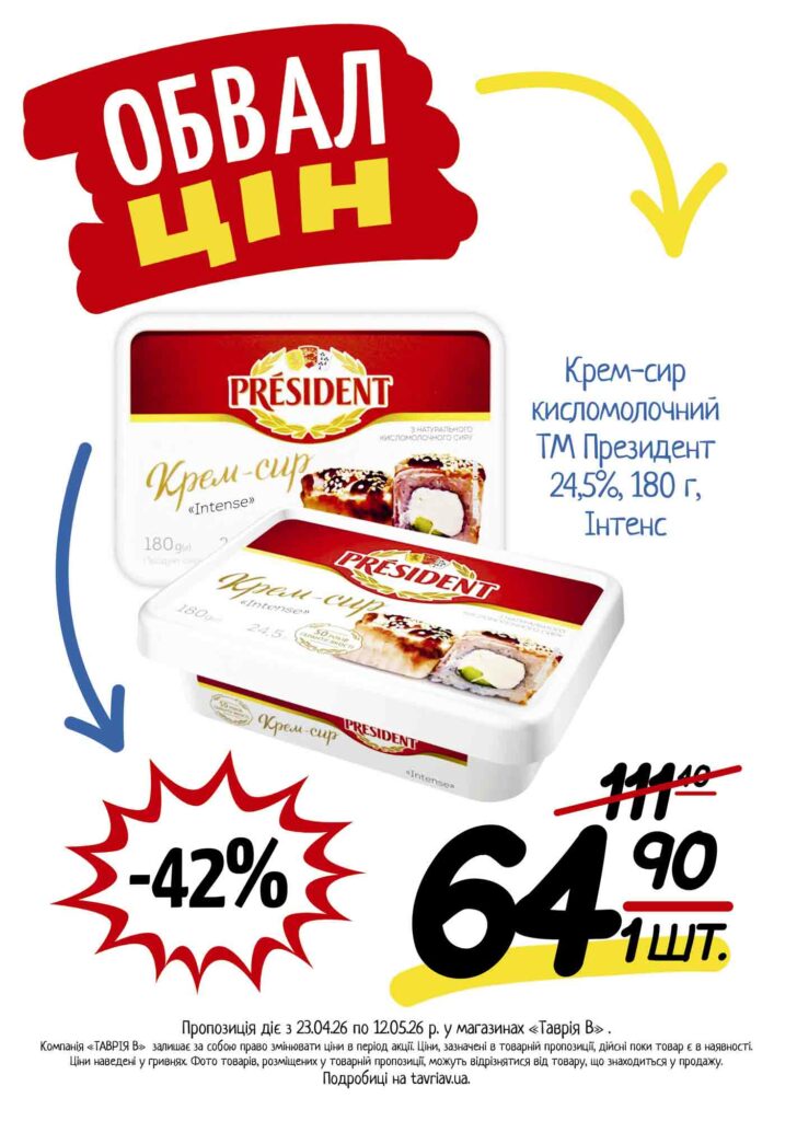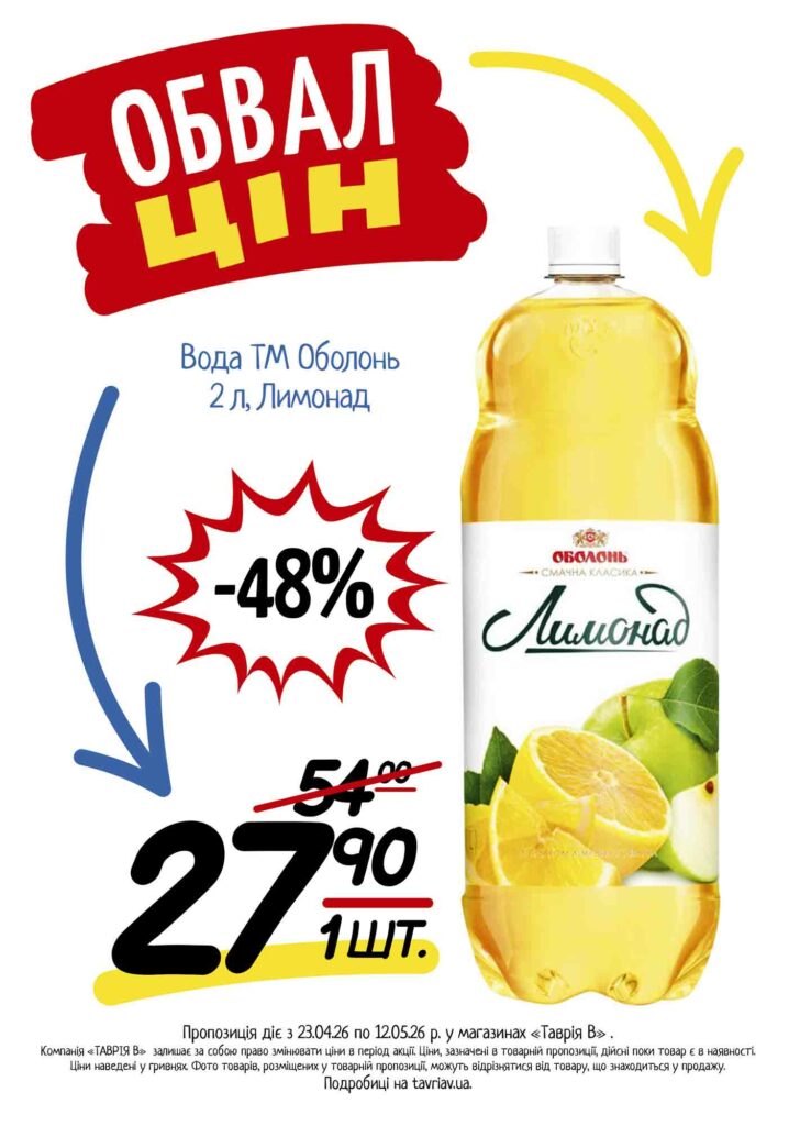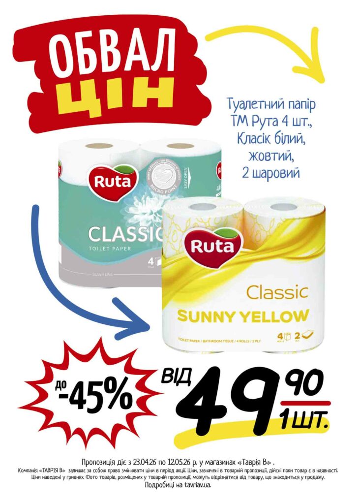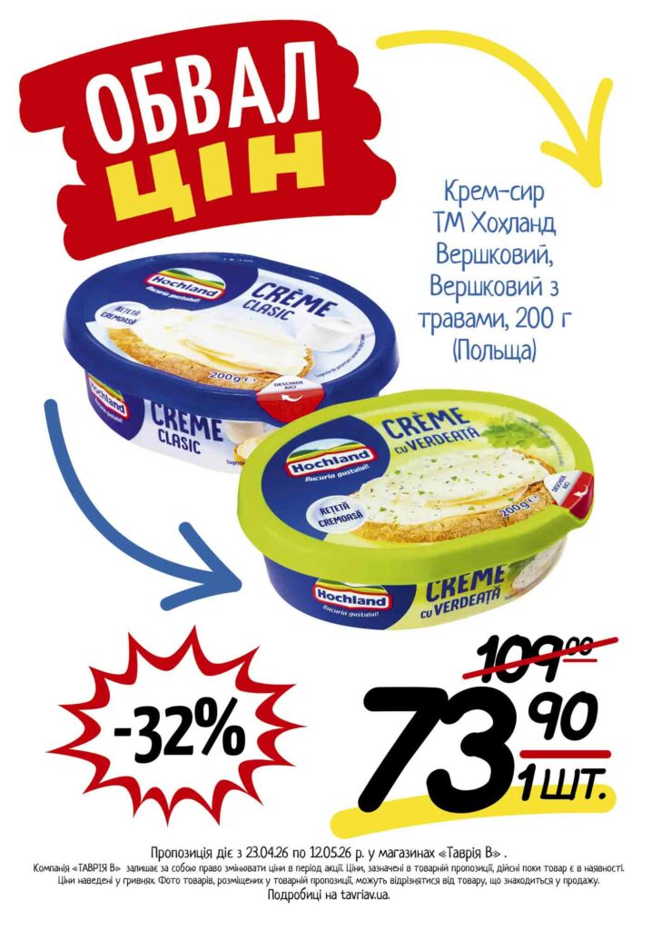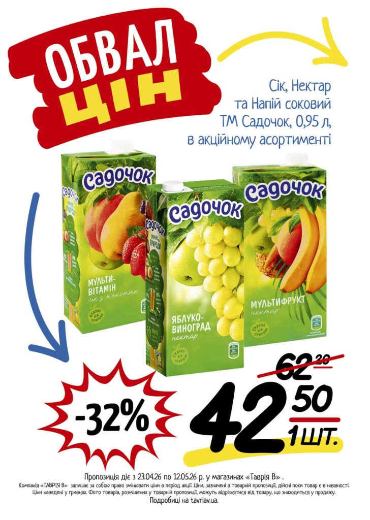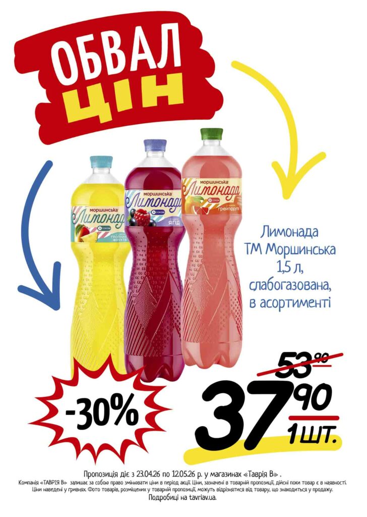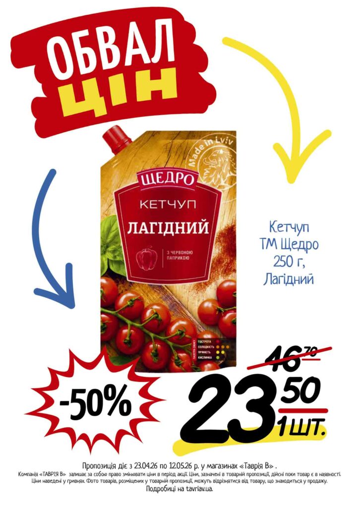 З 23.04 по 12.05.2026 р. в супермаркетах «ТАВРІЯ В» діє акція «Обвал Цін». Ви можете заощаджувати на купівлі продуктів, дитячого харчування, засобів побутової хімії та догляду за собою.