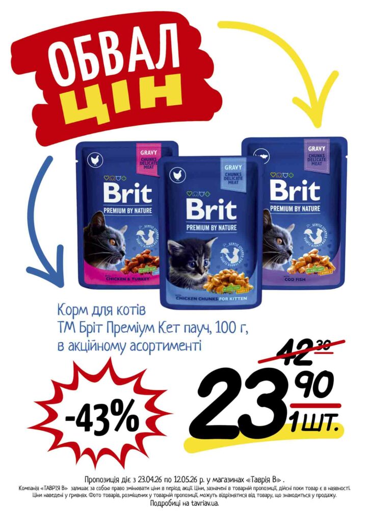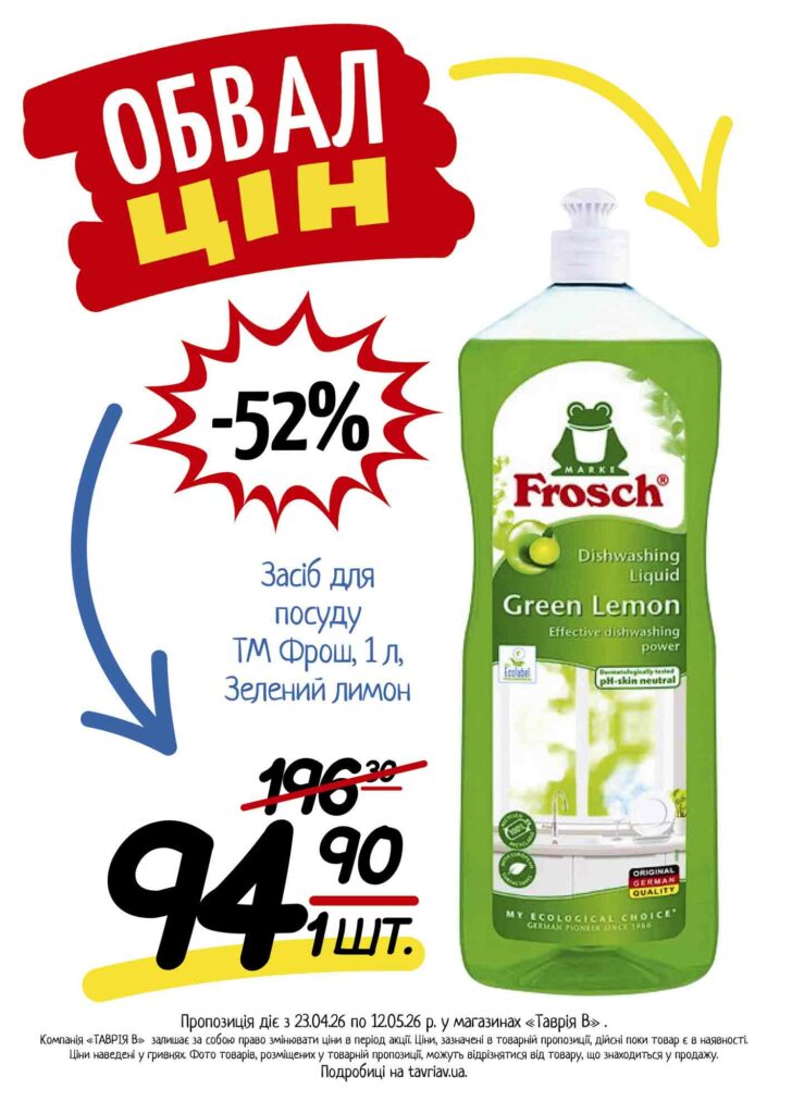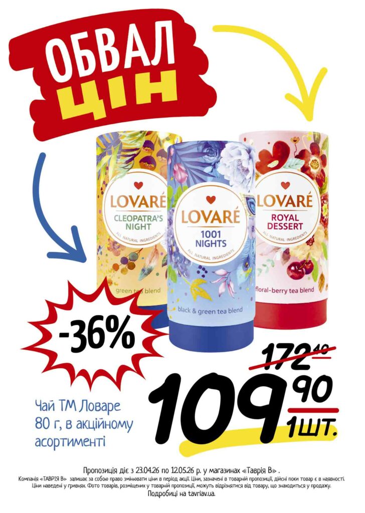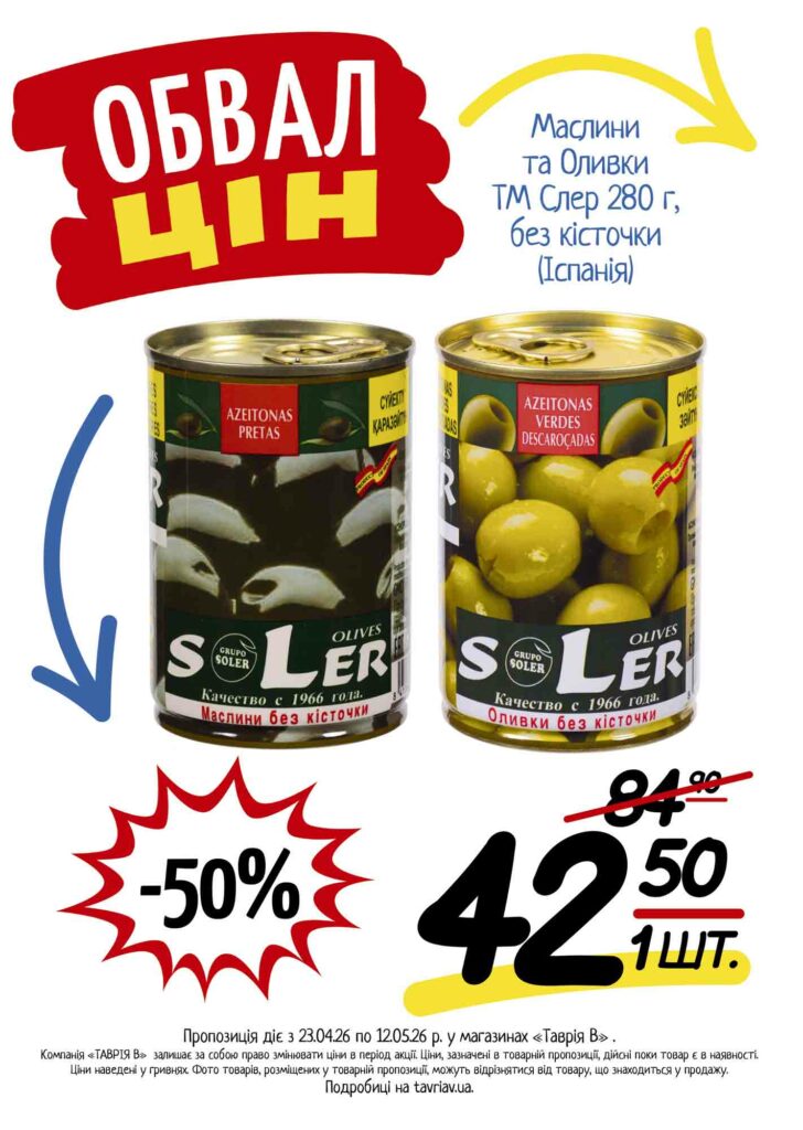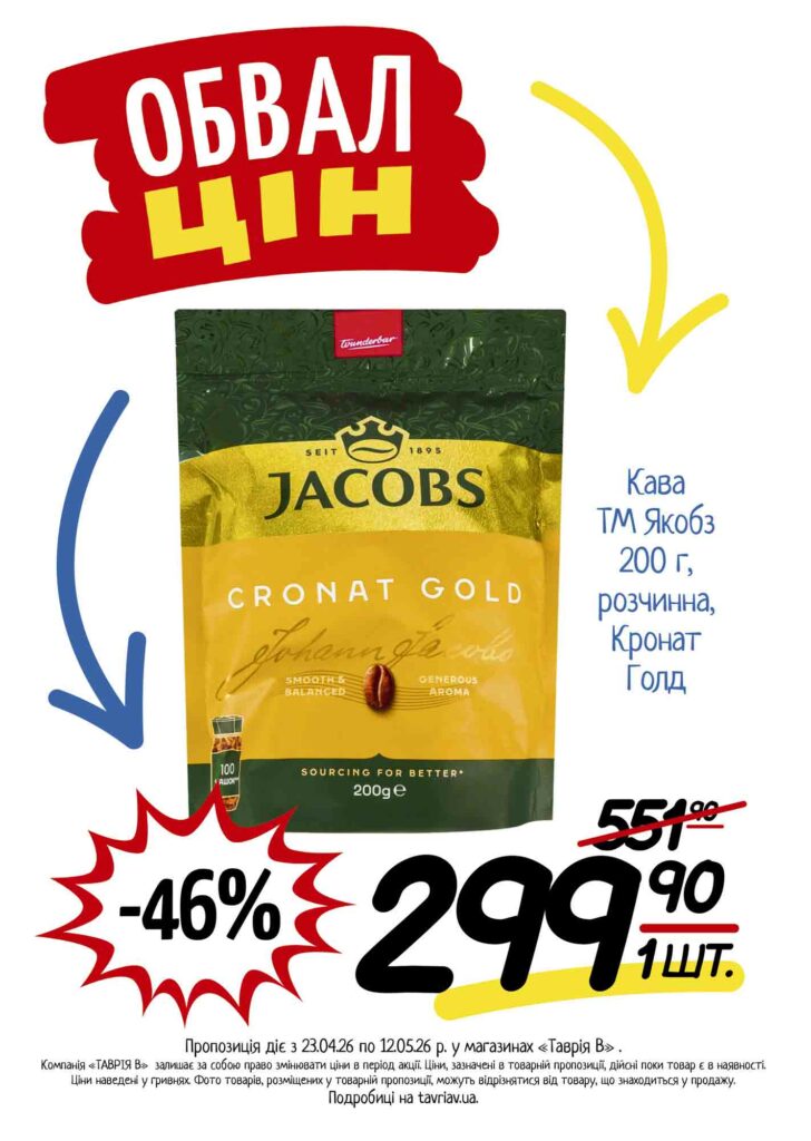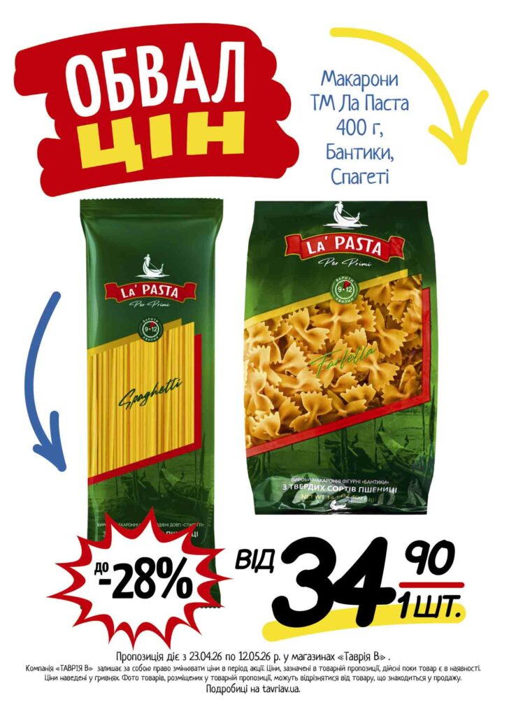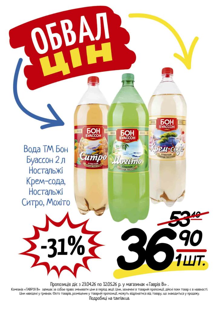 З 23.04 по 12.05.2026 р. в супермаркетах «ТАВРІЯ В» діє акція «Обвал Цін». Ви можете заощаджувати на купівлі продуктів, дитячого харчування, засобів побутової хімії та догляду за собою.