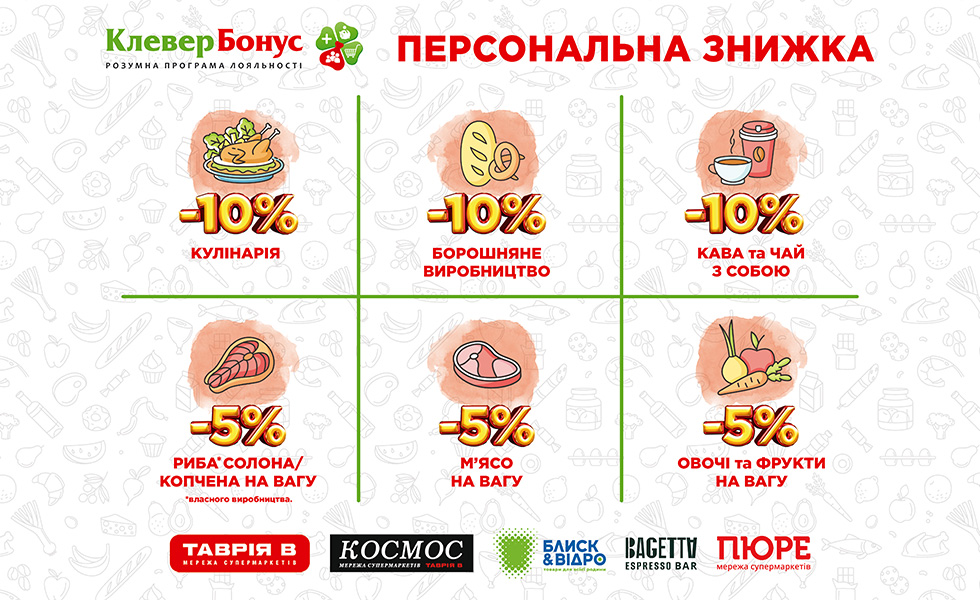 10% – Хліб та випічка власного виробництва, Кулінарія, Кава та чай з собою.