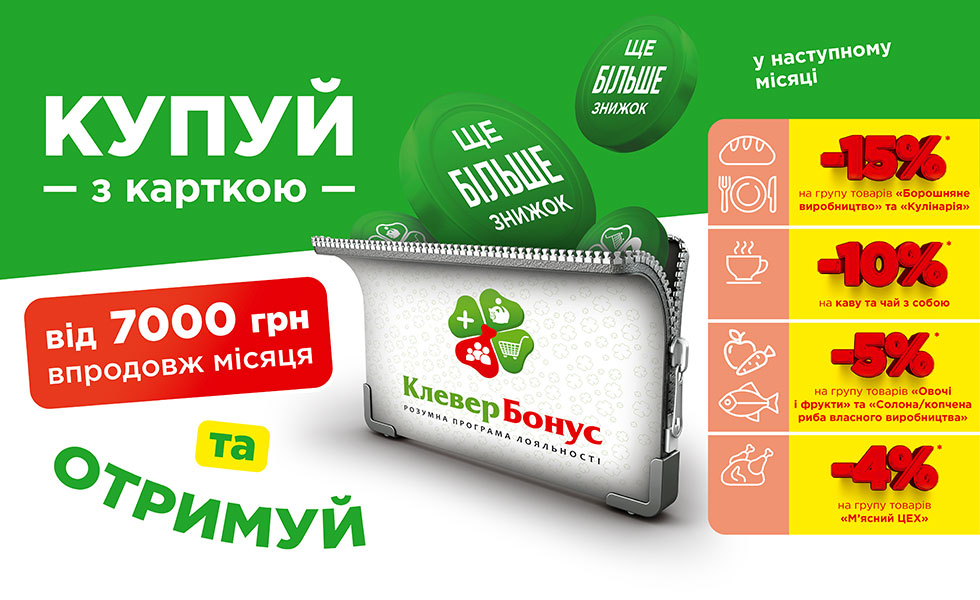 Робіть покупку з картою «КлеверБонус» у мережах супермаркетів «ТАВРІЯ В», «Космос», «Пюре» та кафе «Т-Спрінт кафе» на загальну суму від 7000 грн у поточному місяці.