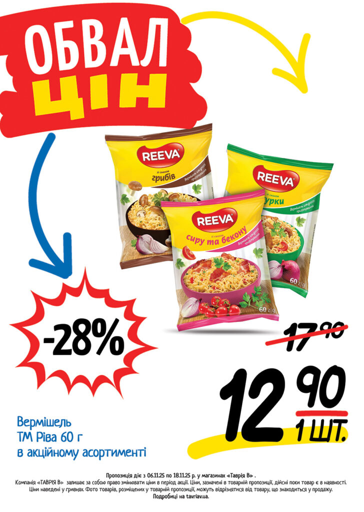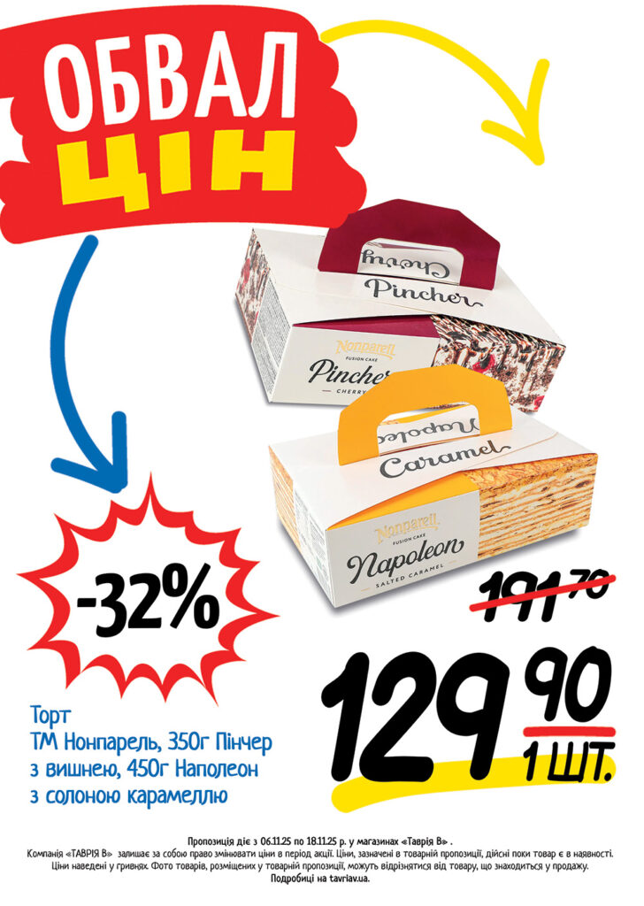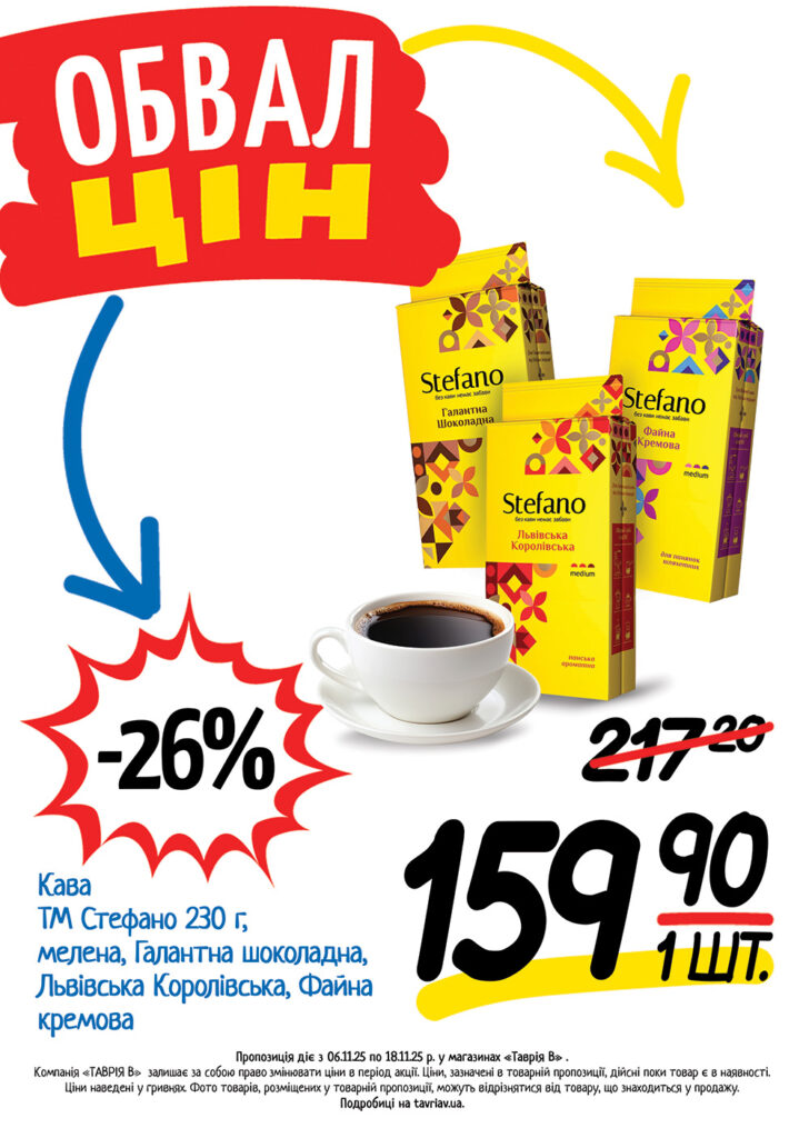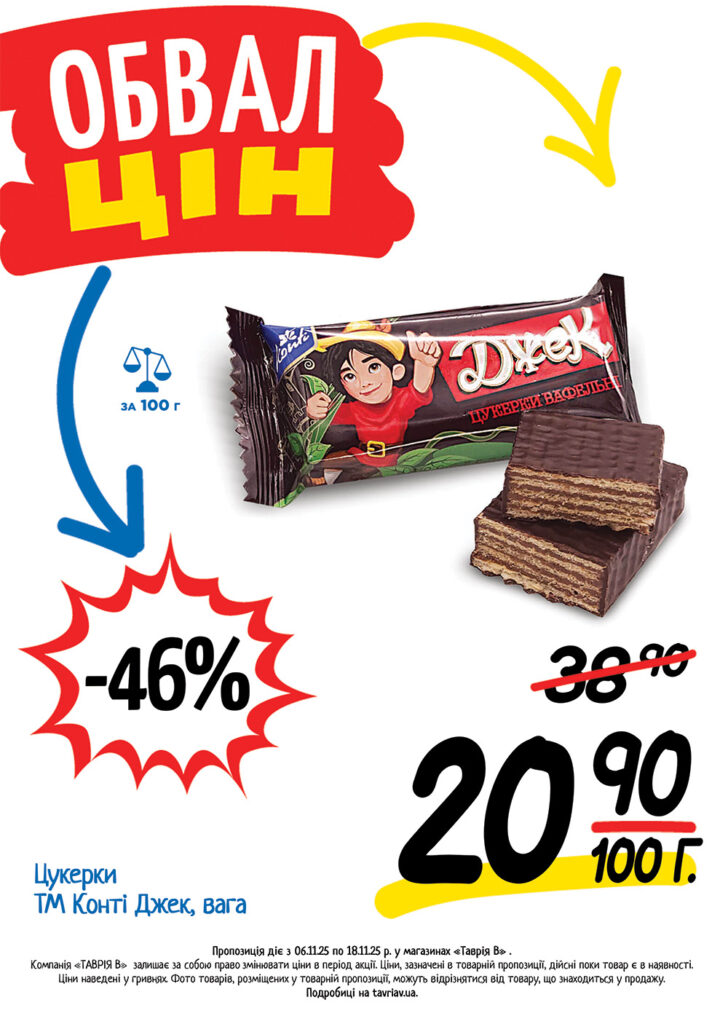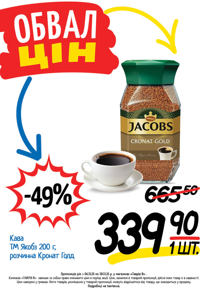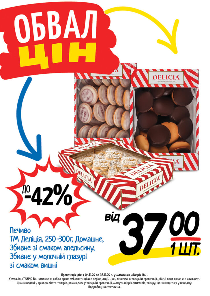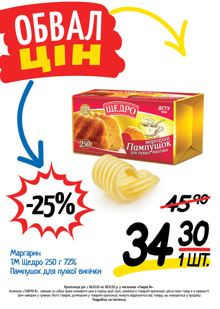 З 06.11 2025 по 18.11.2025 р. в супермаркетах «ТАВРІЯ В» діє акція «Обвал Цін». Ви можете заощаджувати на купівлі продуктів, дитячого харчування, засобів побутової хімії та догляду за собою.